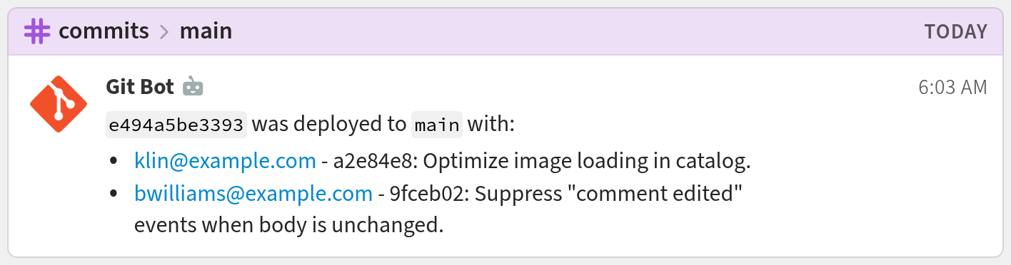 commit_notice_destinationfunction. By default, pushes to themain,master, andtest-post-receivebranches will result in notifications. -